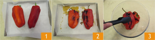 Para preparar la pasta con crema de pimientos y Taleggio, primero lava los pimientos. Colócalos en una bandeja forrada con papel de horno y cocínalos en el horno precalentado a 220 °C durante 30-35 minutos 1. Después de unos 20 minutos, dales la vuelta a los pimientos. Una vez listos 2, transfiérelos a un bol 3.