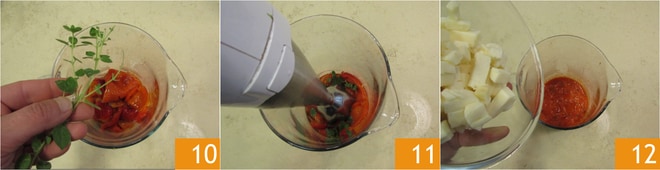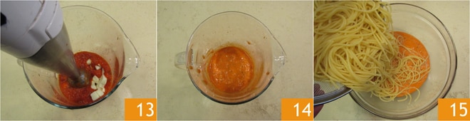 Tritura nuevamente 13 para mezclar bien 14. Una vez que la pasta esté cocida, escúrrela y condiméntala con la crema de pimientos 15.
