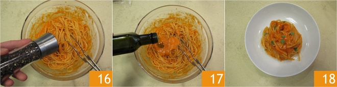 Agrega pimienta 16 y un chorrito de aceite de oliva 17. Sirve la pasta con crema de pimientos y Taleggio bien caliente 18.
