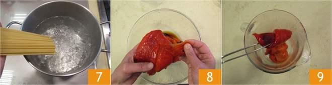 Cuece los espaguetis al dente 7. Mientras tanto, quita la piel de los pimientos aún tibios 8 y colócalos en un vaso alto 9.