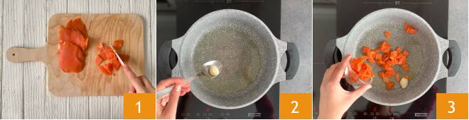 Para preparar la pasta con crema de salmón y calabacines, primero cortad el salmón en trocitos 1. Verted un chorrito de aceite de oliva virgen extra en una sartén y un diente de ajo pelado 2. Sofreíd unos instantes, luego añadid el salmón 3, cocinad durante 2 minutos, removiéndolo de vez en cuando.