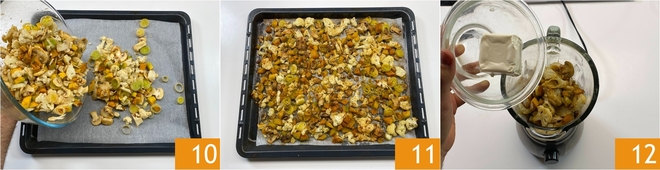 Traspásalas a una bandeja de horno 10, extiéndelas lo más posible y cocinad en horno estático precalentado a 220° durante 25 minutos. Sacad las verduras del horno 11 y dejad que se enfríen un poco. Mientras tanto, poned al fuego una olla llena de agua salada al gusto que servirá para la cocción de la pasta. Verted entonces en el vaso de una batidora las verduras y la robiola 12.