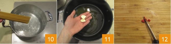 En este punto, cocina la pasta en abundante agua salada en ebullición 10 y mientras tanto prepara el condimento: vierte en una sartén un poco de aceite y el ajo partido por la mitad 11, corta el chile en rodajitas (si prefieres menos picante, puedes quitar las semillas internas) 12.