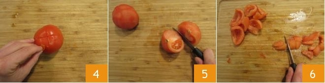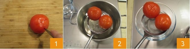 Para preparar la pasta con erizos y tomates, lo primero que hay que hacer es cortar delicadamente la piel del tomate formando una cruz 1. Escalda los tomates durante un par de minutos en agua hirviendo 2, luego escúrrelos 3