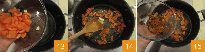 Sofríe el chile y el ajo durante un minuto, luego añade los tomates 13 y cocina por otro minuto aproximadamente. Elimina el diente de ajo 14, añade la pulpa de los erizos, un cucharón de agua de cocción de la pasta y saltea durante 1-2 minutos como máximo. Apaga el fuego.