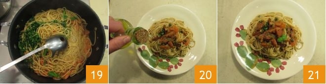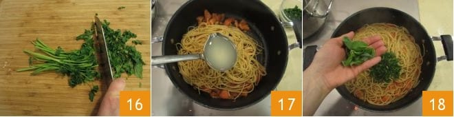 Mientras tanto, pica el perejil 16 y cuando la pasta esté aún al dente escúrrela y transfierela directamente al condimento. Añade un poco más de agua de cocción 17, el perejil picado y las hojas de albahaca 18.