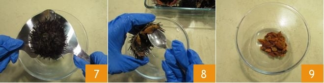 Pasa a los erizos: con la herramienta adecuada divídelos por la mitad 7 y usando una cucharita extrae solo la parte roja (8-9).