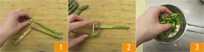 Para preparar la pasta con espárragos y fontina, empieza por limpiar los espárragos. Rompe la parte más dura del tallo 1, luego, con un pelador de verduras, pela el espárrago dejando intacta la parte inicial 2. Todos los recortes que hayas pelado ponlos en una cacerola con 250 gramos de agua 3, agrega también los tallos y déjalos a fuego medio: así obtendrás un caldo rápido que te servirá para continuar con la receta.