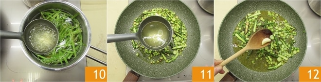Ahora toma un cucharón del caldo de espárragos 10 y viértelo en la sartén 11. Continúa de esta manera hasta que estén cocidos. Sala, añade pimienta y retira el ajo 12.