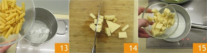 Tan pronto como el agua comience a hervir, echa los tortiglioni 13 y cuécelos un par de minutos menos del tiempo indicado en el paquete. Corta la fontina en trozos 14 y ponla en un cazo con la leche 15.