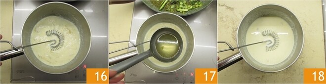 Enciende a fuego muy bajo (no tengas prisa por derretir la fontina, el riesgo es que se corte y no se derrita más). Mezcla con un batidor hasta que todo esté bien integrado 16. Dilúyelo con un cucharón de caldo de espárragos 17, mezcla de nuevo y reserva.