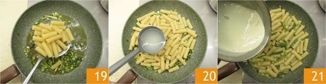 Escurre la pasta al dente directamente en la sartén 19 y saltéala para integrarla con el condimento, añadiendo si es necesario un cucharón de agua de cocción 20. Una vez lista, apaga el fuego y añade la fonduta 21.