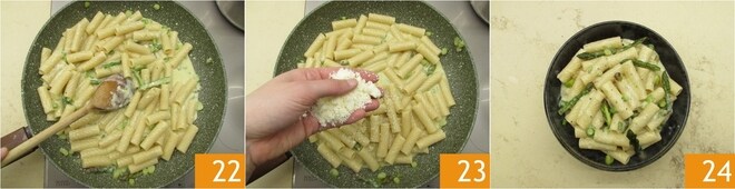 Mezcla bien 22, agrega una pizca de pimienta, el queso parmesano rallado 23 y mezcla de nuevo. Si resulta demasiado densa, añade un poco más de agua de cocción. ¡Sirve enseguida la pasta con espárragos y fontina 24!