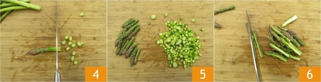 Corta los espárragos en rodajas de aproximadamente 5 mm 4, dejando intactas las puntas 5; luego divídelas por la mitad a lo largo 6. Pon a hervir una olla llena de agua con sal, que servirá para cocinar la pasta.