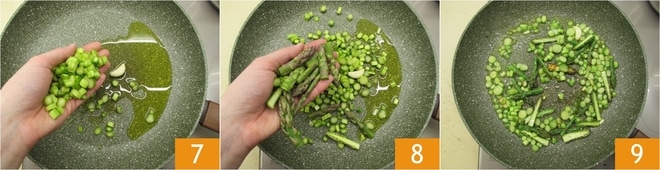 En una sartén antiadherente, dora el diente de ajo entero y agrega los espárragos en rodajas 7 y las puntas 8. Sofríelos durante unos minutos a fuego alto 9.