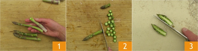Para preparar la pasta con espárragos y panceta, eliminad la parte final de los espárragos más dura 1, cortad los tallos en rodajas 2, mientras que las puntas cortadlas por la mitad 3 y reservadlas.