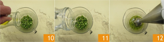 Una vez que los espárragos estén cocidos, retirad aproximadamente 2/3, transferidlos a un vaso alto junto con 20 g de aceite 10, 100 g de agua 11 y batid con una batidora de inmersión 12.