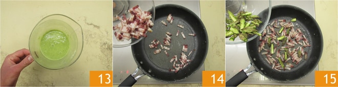 Deberéis obtener una crema suave 13. Reservad la crema, mientras que agregáis la panceta en la sartén utilizada para cocinar los espárragos 14 y dejad dorar durante 2 minutos a fuego medio, removiendo de vez en cuando. Añadid también las puntas de espárrago 15 y dejad dorar durante 5 minutos más.