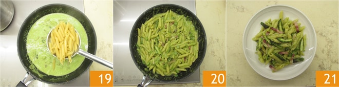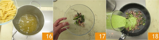 Mientras tanto, coced la pasta al dente 16. Reservad algunas tiras de panceta y puntas de espárragos dorados 17, luego verted también la crema de espárragos en la sartén con el condimento 18, y añadid también las rodajas de espárragos.
