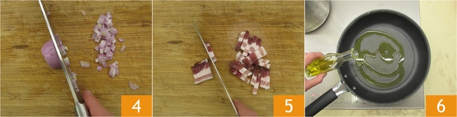 Lavad y picad finamente la chalota 4, cortad la panceta en tiras 5. Poned a hervir el agua para la pasta y salarla cuando esté en ebullición. Mientras tanto, calentad un poco de aceite en una sartén grande 6.