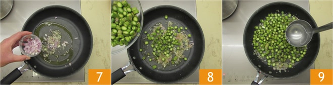 Añadid la chalota picada 7 y dejad dorar a fuego medio durante 2-3 minutos, removiendo de vez en cuando. Agregad los tallos de espárragos en rodajas 8, salpimentad al gusto. Añadid un cazo de agua caliente (del agua de cocción de la pasta) 9. Cocinad todo durante unos 10 minutos, añadiendo un poco de agua caliente si es necesario.