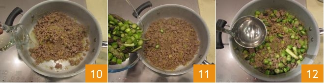 cortad el puerro, ya pelado y recortado, finamente 7 y trasladadlo a una olla grande donde ya habréis calentado el aceite 8. Dejadlo rehogar durante 4-5 minutos, añadiendo un cucharón de agua caliente; luego subid el fuego, añadid la salchicha 9, utilizando una espátula o una cuchara de madera, removiendo continuamente hasta que esté bien dorada.