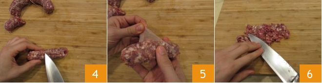 Luego ocupáos de la salchicha, utilizando un cuchillo haced un corte en la tripa 4 y tiradla delicadamente con las manos 5. Siempre sobre una tabla de cortar, utilizando el cuchillo aplastad ligeramente la salchicha 6, para desmenuzarla. Mantened también esta aparte por un momento,