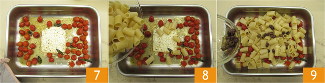 Mientras tanto, saque la bandeja del horno 7, escurra la pasta en ella 8 y añada las aceitunas deshuesadas 9.