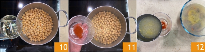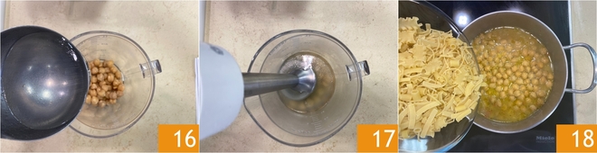 Saca un cazo de garbanzos y viértelo en un vaso, luego añade un cazo del agua que has calentado para la pasta 16 y tritura todo con una batidora de inmersión para obtener una crema 17. Ahora añade la pasta a los garbanzos 18.<\/p>
