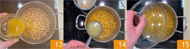 Añade este líquido a los garbanzos 13 junto con otro cazo de agua de cocción de los mejillones. No es necesario salar ya que el agua de los mejillones contribuirá a dar el sabor adecuado. Cubre con la tapa 15 y cocina durante 5-10 minutos. Mientras tanto, lleva a ebullición 500 g de agua para cocinar la pasta.<\/p>