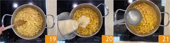 Mezcla 19 y también incorpora la crema de garbanzos 20. Vierte con un cazo del agua que llevaste a ebullición para cocinar la pasta 21.<\/p>