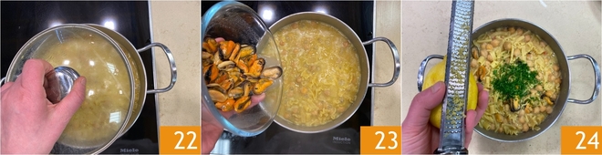 Cubre con la tapa y lleva a cocción la pasta añadiendo poco a poco el agua, como se hace con el risotto 22. Un minuto antes del final de la cocción, añade los mejillones sin cáscara 23. Mezcla y retira del fuego: completa con perejil picado y la cáscara rallada del limón 24.<\/p>