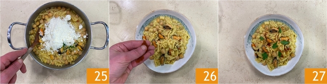 Remueve con pecorino rallado 25, mezcla bien y sirve la pasta con garbanzos y mejillones bien caliente con chile en polvo al gusto 26 y perejil fresco 27.<\/p>