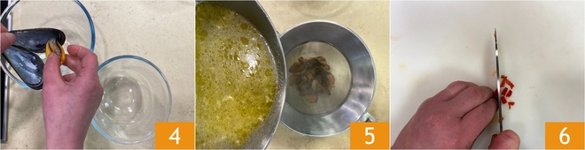 Una vez abiertos, retira las cáscaras 4. Filtra el agua de cocción y viértela sobre los mejillones, así no se secarán 5. Ahora pica el chile fresco 6.<\/p>