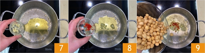 En la misma olla en la que cocinaste los mejillones, añade otro chorrito de aceite, un diente de ajo picado 7 y el chile fresco 8. Deja sofreír durante un par de minutos, luego añade los garbanzos precocidos 9 y sofríe brevemente.<\/p>