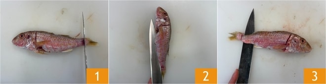 Para realizar la pasta con pescados humildes, empezad por la limpieza de los salmonetes: haced un corte con el cuchillo debajo de la cabeza y encima de la cola 1, luego pasad la hoja sobre la espina a lo largo del vientre, tanto por un lado como por el otro 2 y finalmente retirad los filetes obtenidos 3. Haced lo mismo del otro lado. Aseguraos de que la cabeza y la cola queden adheridas a la espina central y guardad los restos que os servirán posteriormente para el fondo.