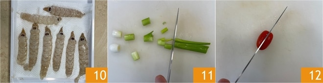 Extraed la pulpa con cuidado de dejarla entera 10 y guardad los restos. Ahora podéis dedicaros al fondo: limpiad el cebollino y cortadlo en trozos 11, luego dividid los tomates cherry por la mitad 12.