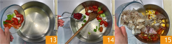 En una olla, verted un hilo de aceite, el cebollino y los tomates cherry 13, luego añadid el concentrado de tomate y tostádlo a fuego vivo durante unos minutos 14. En este punto, unid los restos de los salmonetes y de las galeras que habéis reservado 15. Tostad durante 3-5 minutos más a fuego vivo, aplastando bien los restos con una espátula para que suelten todos los jugos.