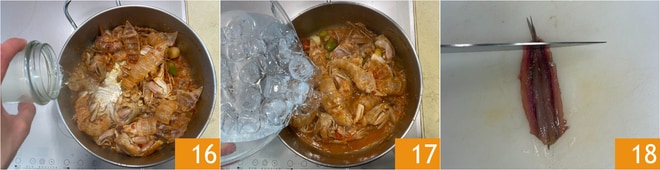 Cuando comience a pegarse al fondo de la olla, desglasad con el vino blanco 16 y raspad bien el fondo con la espátula. Esperad a que la parte alcohólica se evapore por completo, luego añadid hielo y agua fría y bajad el fuego: el descenso de temperatura permitirá extraer mejor los sabores 17. Dejad hervir a fuego lento durante unos 30 minutos, cuidando de retirar la espuma que pueda emerger en la superficie debido a las impurezas. Mientras tanto, ocupáos de los otros pescados eliminando las extremidades de las sardinas y los boquerones, ya limpios y abiertos en libro 18.