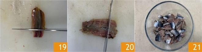 Cortad los boquerones 19 y las sardinas en trozos del mismo tamaño que los salmonetes 20 y reservad 21.