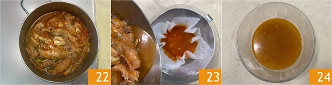 Transcurrido el tiempo de cocción del fondo 22, filtradlo a través de un colador forrado con un paño de papel húmedo (o gasa alimentaria) para eliminar todos los residuos 23. Reservad el fondo 24 y poned a hervir una olla de agua para cocer la pasta.