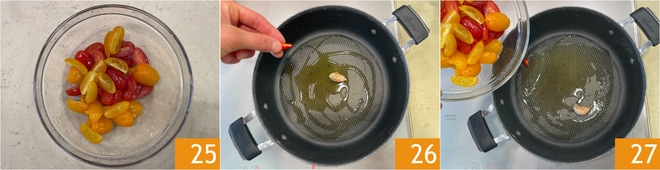 Para preparar la salsa, cortad los tomates cherry más pequeños por la mitad y los más grandes en cuartos 25. En una cacerola, dorad un diente de ajo aplastado y una guindilla con un hilo de aceite 26, luego añadid los tomates cherry 27.