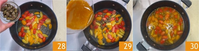 Rehogad a fuego vivo, luego añadid las aceitunas 28. Cuando los tomates cherry empiecen a marchitarse, verted el fondo 29 y continuad cocinando para reducirlo aún más 30.