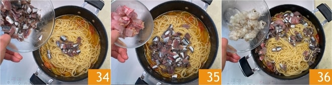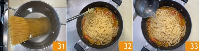 Mientras tanto, el agua habrá llegado a ebullición, así que saládla y añadid los espaguetis 31. Escurrid los espaguetis 4 minutos antes del final del tiempo de cocción y trasladadlos a la sartén con el condimento 32. Cocinad la pasta en la sartén hasta terminar la cocción, ayudándoos con un cucharón de su agua 33.