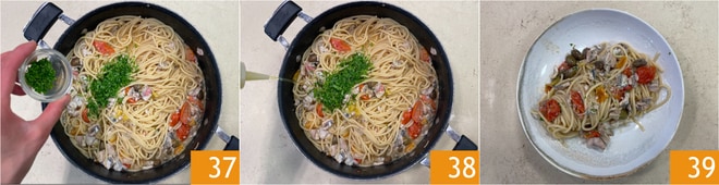 Retirad la sartén del fuego y aromatizad con el perejil picado 37, luego mezclad la pasta vertiendo el aceite en hilo mientras removéis; de esta manera resultará brillante y cremosa 38. Emplatad y servid enseguida vuestra pasta con pescados humildes 39.