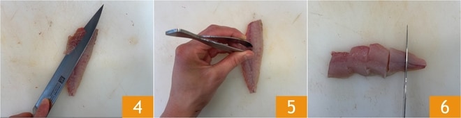 Acabad de limpiar los filetes 4 y eliminad las espinas con unas pinzas de cocina, ayudándoos con los dedos para encontrarlas 5. Por último, cortad los filetes limpios en trozos 6.