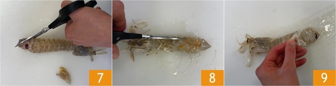 Pasad a la Cómo limpiar las galeras: con unas tijeras cortad las extremidades de la cola para formar un triángulo 7, luego realizad cortes a lo largo de los lados 8 y retirad el caparazón 9.