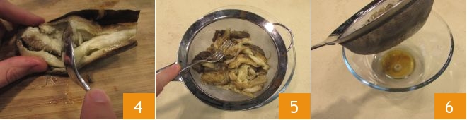 luego extrae la pulpa rascándola con una cuchara 4. Coloca la pulpa de berenjenas en un colador de malla fina colocado sobre un bol y presiona con el dorso de una cuchara o un tenedor 5 para eliminar el agua de vegetación 6.