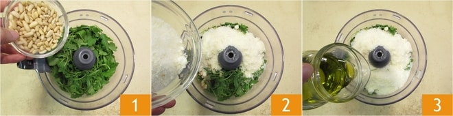 Para preparar la pasta con pesto de rúcula, berenjenas en aceite y stracciatella, lo primero que debes hacer es el pesto. Lava bien la rúcula, sécala y colócala en el vaso de una batidora. Añade también los piñones 1, el Grana, el Pecorino 2 y una pizca de sal. Ahora vierte el aceite de oliva virgen extra 3 y comienza a batir.