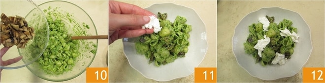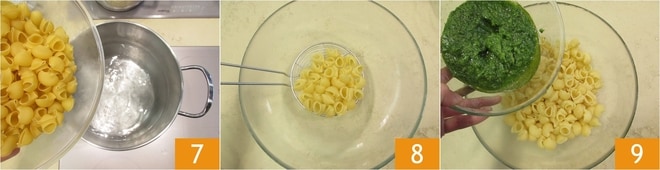 Tan pronto como el agua comience a hervir, echa la pasta 7 y cuécela durante el tiempo indicado. Escúrrela y transfiérela a un bol 8, añade el pesto 9 y mezcla bien.